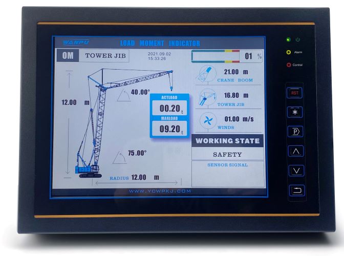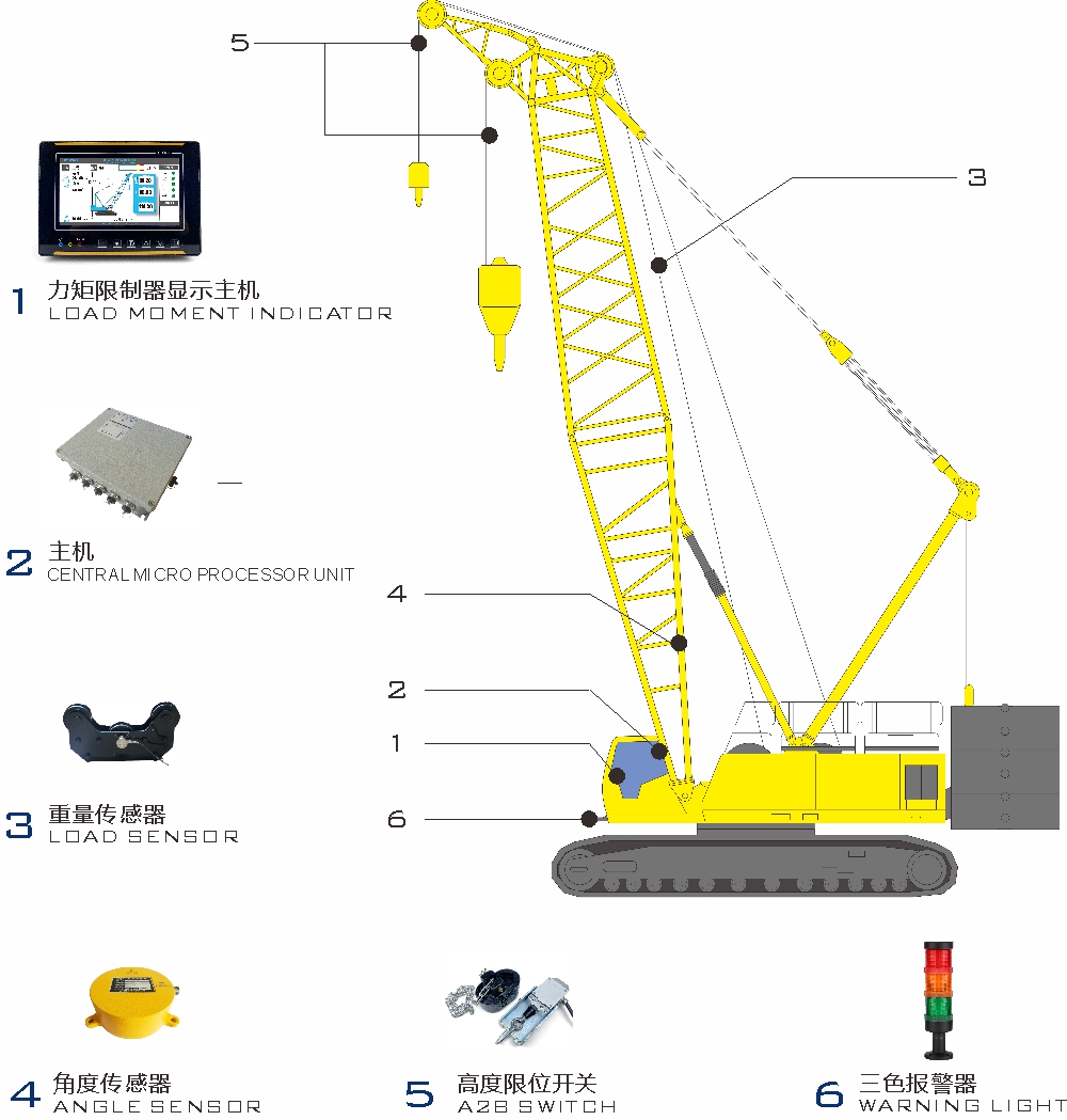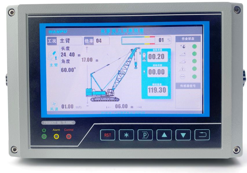 履帶式起重機力矩限制器主要由力矩限制器顯示器、主機、角度傳感器、重量傳感器等組成。通過各傳感器檢測信號,可以實時在顯示器上顯示起重機的額定起重量、實際起重量、臂長、角度等信息,并根據(jù)情況輸出報警信號和控制信號,輔助作業(yè)人員安全操作起重機。