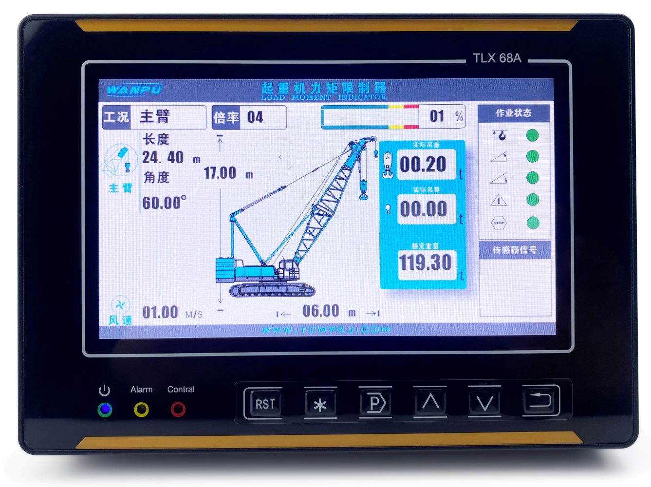 顯示:實時顯示額定起重量、實際起重量、吊臂長度、吊臂角度、作業(yè)幅度等。