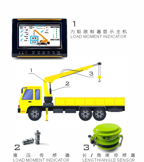 隨車起重機(jī)力矩限制器主要由力矩限制器顯示主機(jī)、液壓傳感器、長/角度傳感器組成。通過各傳感器檢測信號,可以實時在顯示器上顯示起重機(jī)的額定起重量、實際起重量、臂長、角度等信息,并根據(jù)情況輸出報警信號和控制信號,輔助作業(yè)人員安全操作起重機(jī)。