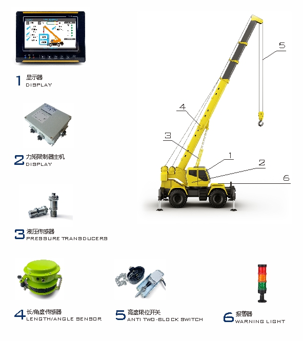 Mobile cranes are mobile cranes that mount lifting equipment onto general-purpose or specially designed truck chassis. They are the most common and widely used type of crane in daily operations, renowned for their exceptional mobility and flexibility. Safety is the foremost concern for all personnel operating truck cranes. The load moment indicator(load moment limiter) for truck cranes effectively addresses this concern. Equipped with multiple monitoring sensors—including length sensors, angle sensors, and hydraulic sensors—it continuously monitors crane safety in real time by tracking parameters such as rated capacity, actual load, real-time moment, boom length, boom angle, and working radius. Additionally, it provides historical records, significantly enhancing the safety of both the truck crane and its operators.